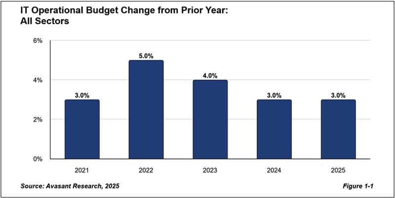 There is a pattern here that is outlasting major global macroeconomic realities. This pattern pre-dates the COVID-19 pandemic, the major conflicts in Ukraine and around the world, and extends through tariff threats and global trade wars, the explosive growth of generative AI, and countless other changes. For about a decade, companies have increased their IT spending by about 3.0% every year, regardless of the state of the economy or the political atmosphere. And for the most part, CIOs have reported in those same periods that they are “OK” with that budget and that it was roughly adequate to suit their needs.