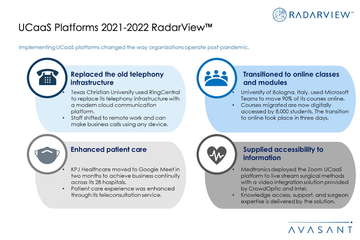 Amid the pandemic, UCaaS platforms were a key factor in business continuity and enabled many enterprises to transform their business models. Organizations are moving away from isolated hosted chat or calling applications toward an integrated approach to UCaaS. This was especially seen in the education and healthcare industries, as they transitioned to online courses and telehealth services.