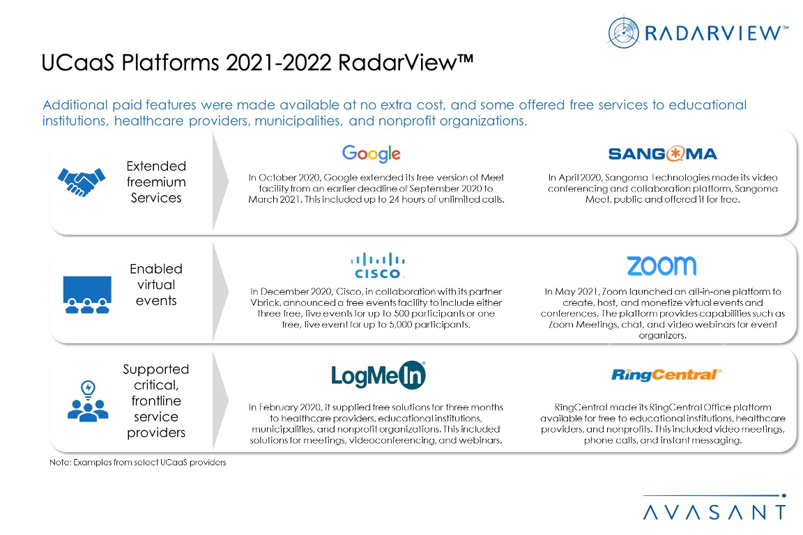 This RadarView includes an analysis of the following UCaaS platform providers: 8×8, Cisco, Dialpad, Fuze, Google, LogMeIn, Microsoft, Mitel, Nextiva, RingCentral, Sangoma (Star2Star), Slack, Vonage, Windstream, and Zoom.