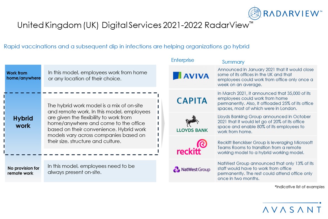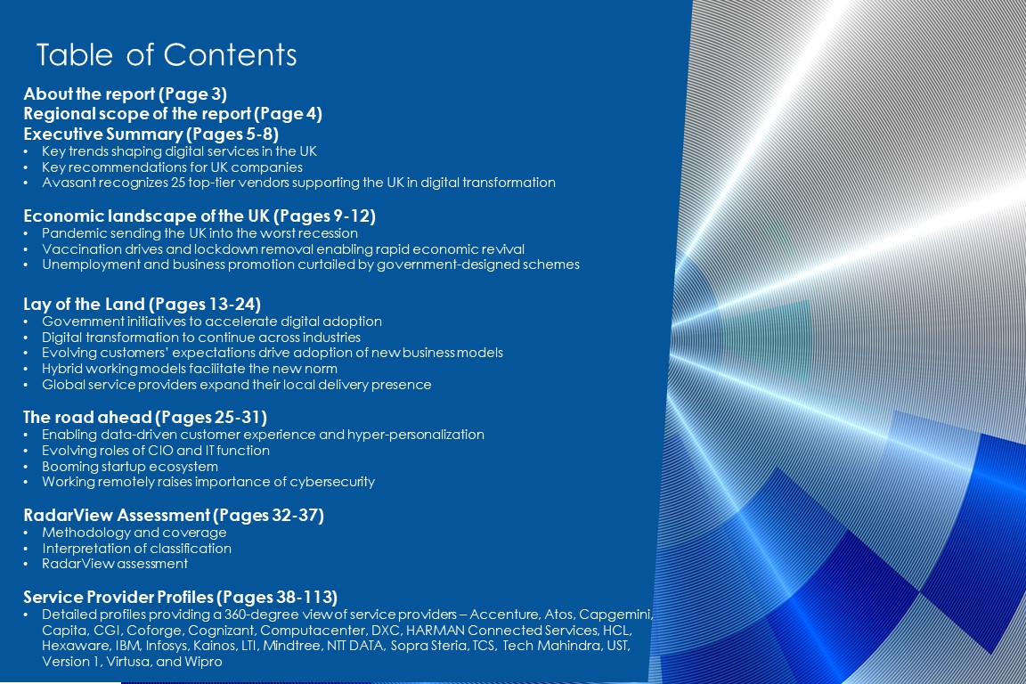 This RadarView includes an analysis of the following service providers in the UK digital services space: Accenture, Atos, Capgemini, Capita, CGI, Coforge, Cognizant, Computacenter, DXC, HARMAN Connected Services, HCL, Hexaware, IBM, Infosys, Kainos, LTI, Mindtree, NTT DATA, Sopra Steria, TCS, Tech Mahindra, UST, Version 1, Virtusa, and Wipro.