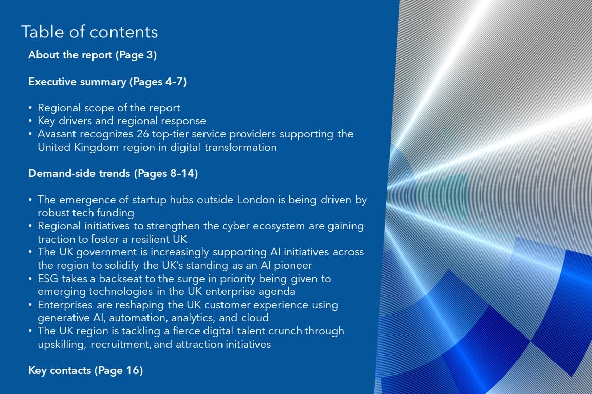 This report identifies key demand-side trends in the United Kingdom (UK) region that can help enterprises fine-tune their digital strategies. It also provides an overview of enterprise challenges in this region based on Avasant’s assessment.