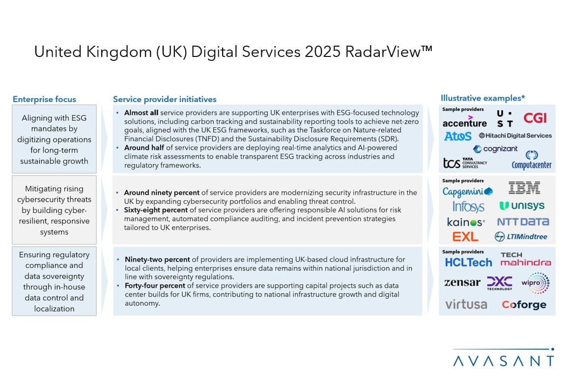 The United Kingdom (UK) Digital Services 2025 RadarView™ highlights key supply-side trends in the UK region’s digital services market and Avasant’s viewpoint on them. It aids UK enterprises in identifying top service providers to assist them in digitalizing their services. It also analyzes each service provider’s capabilities in technology and delivery support, enabling organizations to select the right strategic partners for the UK region.