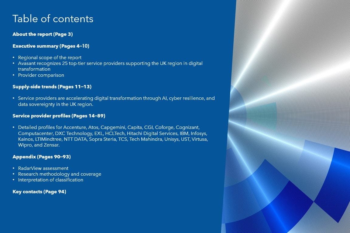 This RadarView™ is designed to support enterprises in the UK in developing a resilient digital services strategy by leveraging market outlook, proven practices, and transformation initiatives. It begins with a summary of the key supply-side trends shaping the UK digital services landscape and follows with an in-depth evaluation of 25 leading service providers. Each profile offers an overview of the provider’s capabilities, industry-specific offerings, representative clients and partnerships, and concise case studies. The profiles conclude with analyst insights on practice maturity, investments and innovation, and ecosystem development. This report serves as a guide for businesses to identify the right partners for their digital transformation efforts.