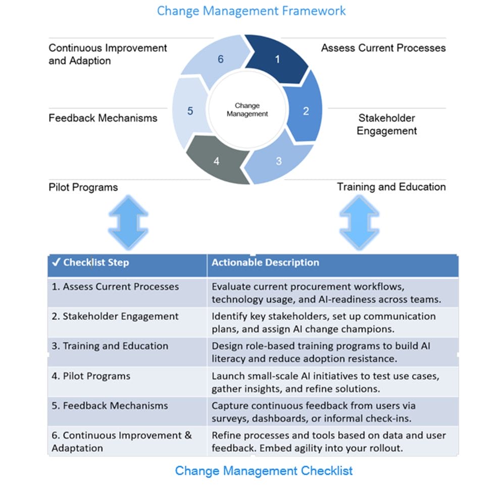 Amidst these technical and regulatory complexities, organizations must also orchestrate cultural and procedural transformation. Effective change management is essential to successful AI adoption. Success starts with evaluating current procurement processes, identifying inefficiencies, and mapping opportunities for AI integration, particularly in tasks that are repetitive, time-consuming, or error-prone. Gaining executive sponsorship and early stakeholder engagement is critical to building internal momentum and reducing resistance. When employees understand the ‘why’ behind the technology, they are more likely to embrace the ‘how.’ Training that demystifies AI and shows its practical use builds employee confidence to adopt it in daily workflows.