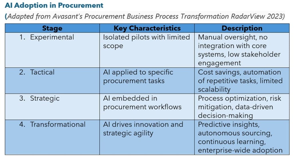 Walmart’s AI journey illustrates how targeted pilots and stakeholder alignment can unlock measurable procurement value, but what broader lessons can procurement leaders take from this success? To better understand the evolution of AI in procurement, Table 1’s framework—adapted from Avasant’s Procurement Business Process Transformation RadarView 2023—outlines four key maturity stages: