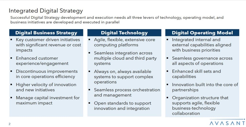 To move from experimentation to enterprise-wide impact, procurement leaders must align AI initiatives with broader operating models. Avasant’s Integrated Digital Strategy (as shown in Table 2 below) provides a blueprint for this alignment—integrating AI across three levers to ensure that technology investments deliver measurable business outcomes, from cost savings to supplier innovation.