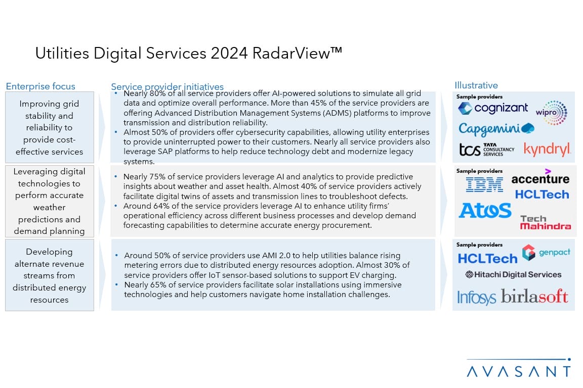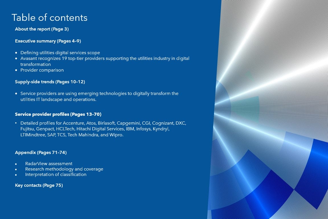 This RadarView includes an analysis of the following service providers in the utilities digital services space: Accenture, Atos, Birlasoft, Capgemini, CGI, Cognizant, DXC, Fujitsu, Genpact, HCLTech, Hitachi Digital Services, IBM, Infosys, Kyndryl, LTIMindtree, SAP, TCS, Tech Mahindra, and Wipro.