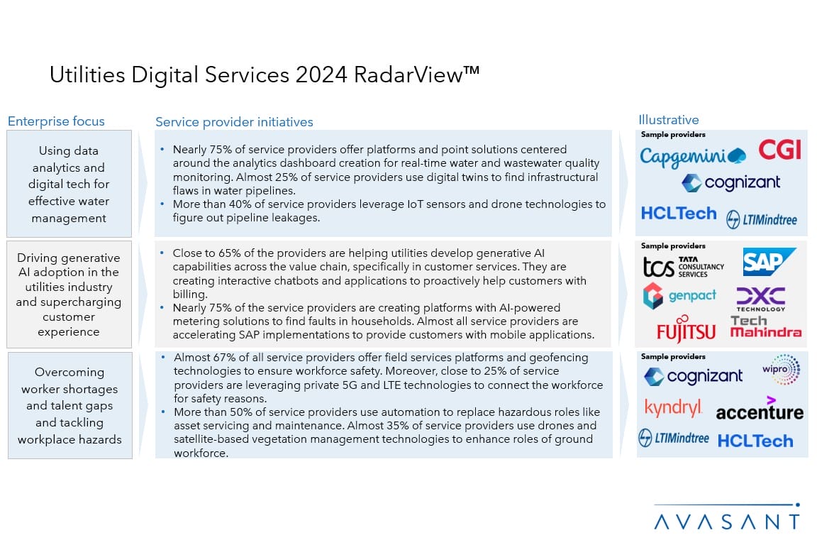 The Utilities Digital Services 2024 RadarView™ highlights key supply-side trends in the utilities space and Avasant’s viewpoint on them. It aids utility companies in identifying top service providers to assist them in digitalizing their services. It also analyzes each service provider’s capabilities in technology and delivery support, enabling organizations to select the right strategic partners for the utilities industry.