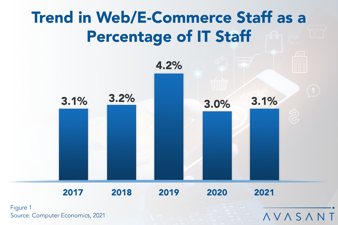 Web/e-commerce support personnel play a critical role in organizations, and that has become even more clear in the midst of the COVID-19 pandemic. In this report, we provide benchmarks for staffing functions related to web and e-commerce development and operations. We benchmark web staffing with two ratios: web/e-commerce staff as a percentage of the IT staff and users per web/e-commerce staff member. Benchmarks are provided by organization size. We also assess the influence of sector on web/e-commerce staffing ratios. (5 pp., 1 fig.)