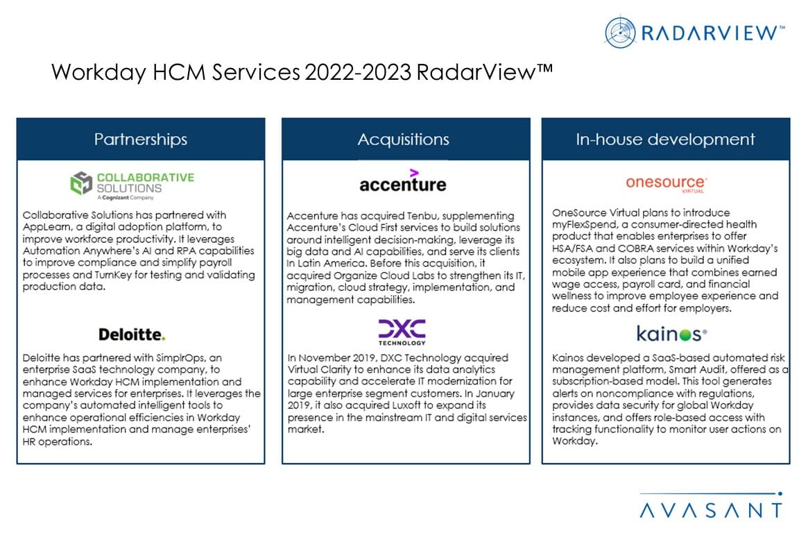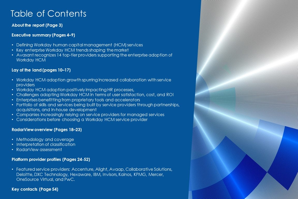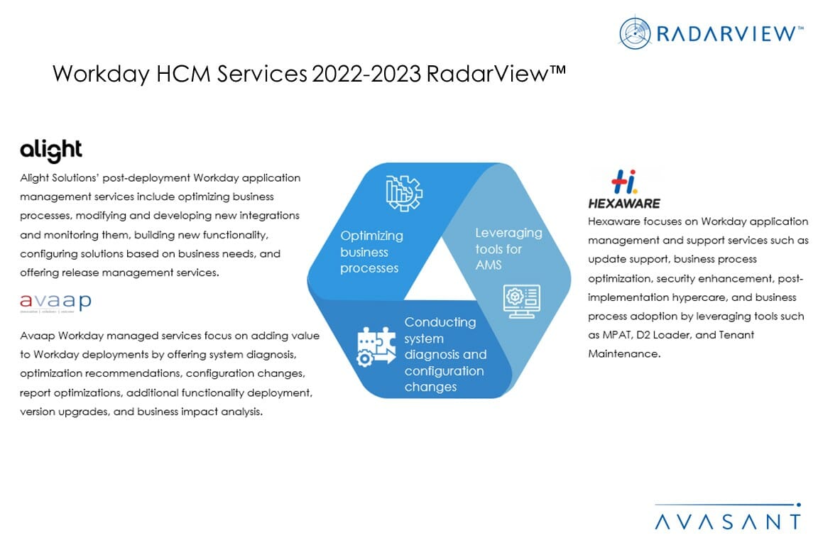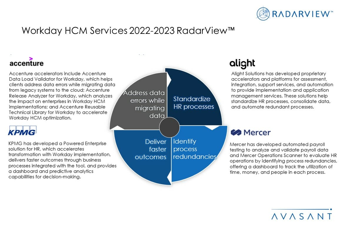 This RadarView includes a detailed analysis of the following Workday HCM service providers: Accenture, Alight, Avaap, Collaborative Solutions, Deloitte, DXC Technology, Hexaware, IBM, Invisors, Kainos, KPMG, Mercer, OneSource Virtual, and PwC.