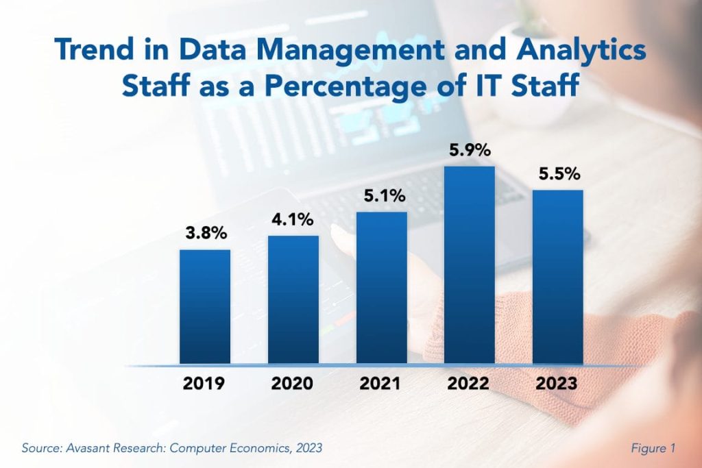 The amount of data that IT organizations need to manage is growing with no end in sight. Whether it be sensor data from IoT devices, social networking data, online advertising and e-commerce transactions, or multimedia files, the complexity of the data to be analyzed also is increasing. With the continued growth of data and its importance in the day-to-day activities of organizations, it is surprising that the data management and analytics function has decreased this year. After significant growth over previous years, this staffing ratio has declined to 5.5% in 2023 from 5.9% in 2022.
