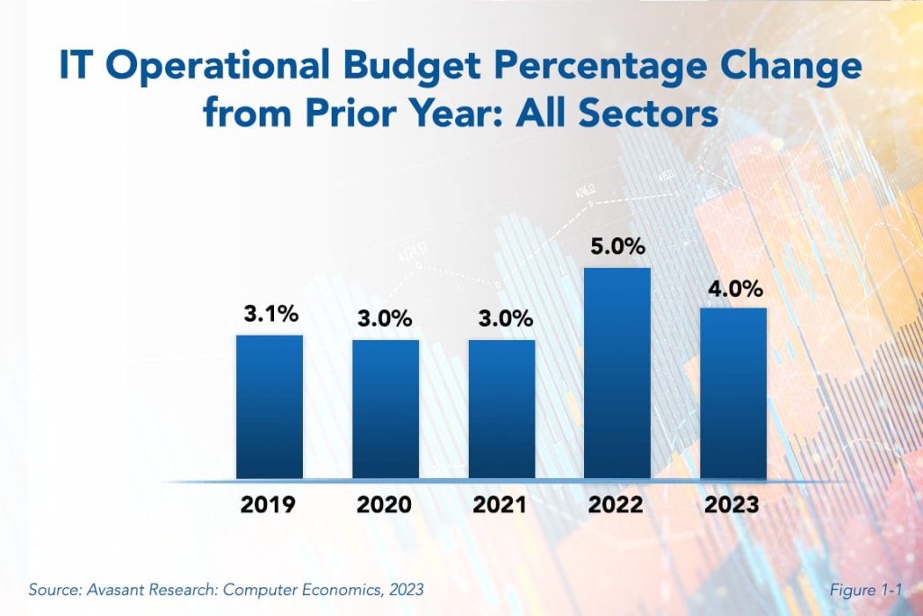 The IT spending outlook for 2023 can best be described with the old British slogan, “keep calm and carry on.” For at least a year, enterprises have been expecting the recessionary shoe to drop as central banks raised interest rates to fight inflation. War in Ukraine and increasingly brittle supply chains have not helped. By now, we would have expected more companies to be cautiously preserving cash, preparing for a recession. And yet, for the most part, businesses are not cutting IT budgets. This research byte is a brief description of some of the findings in our IT Spending and Staffing Benchmarks 2023/2024 study.