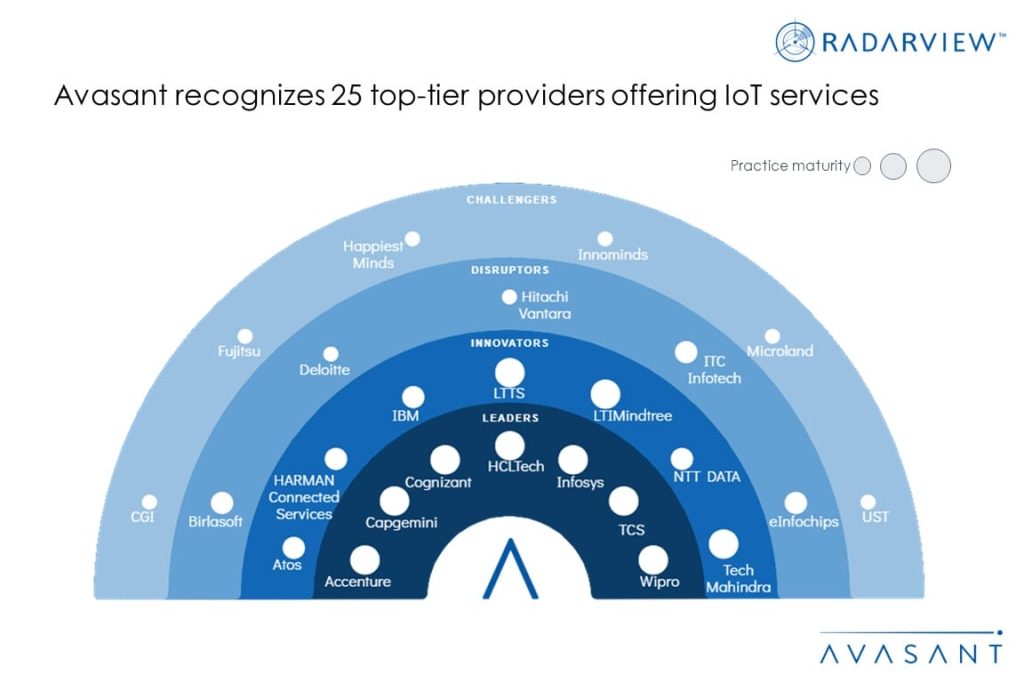 IoT technology has become mainstream, as evidenced by the steady rise in the adoption of connected devices. The share of production-grade projects increased from 68% in 2021 to 73% in 2022. Across three key segments—Industrial Internet of Things (IIoT), connected infrastructure, and Consumer IoT—IIoT continues to lead in adoption driven by smart manufacturing and Industry 4.0 use cases, including digital twins. The connected infrastructure segment saw significant growth pushed by smart city initiatives, including urban mobility, energy management, and waste management. Sustainability has emerged as a new growth lever in IoT services. These and other trends focused on the demand-side and supply-side are covered in our Internet of Things Services 2023 Market Insights™ and Internet of Things Services 2023 RadarView™, respectively.