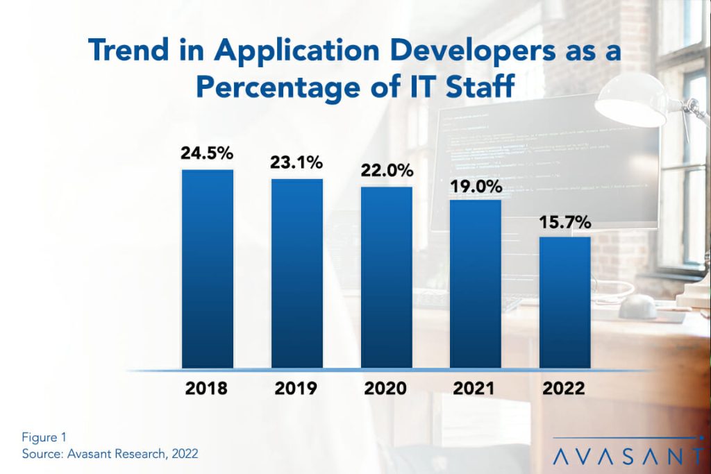 The process of developing and maintaining enterprise applications is changing. Agile methodologies and DevOps are contributing factors to the decline in application developer staffing ratios. Low-code/no-code, rapid application development approaches that aim to reduce coding and application development times further reduce the need for developers. Developers still make up the largest portion of most IT organizations, and they are quite expensive. Therefore, IT leaders should assess their developer needs in order to optimize their personnel budgets.