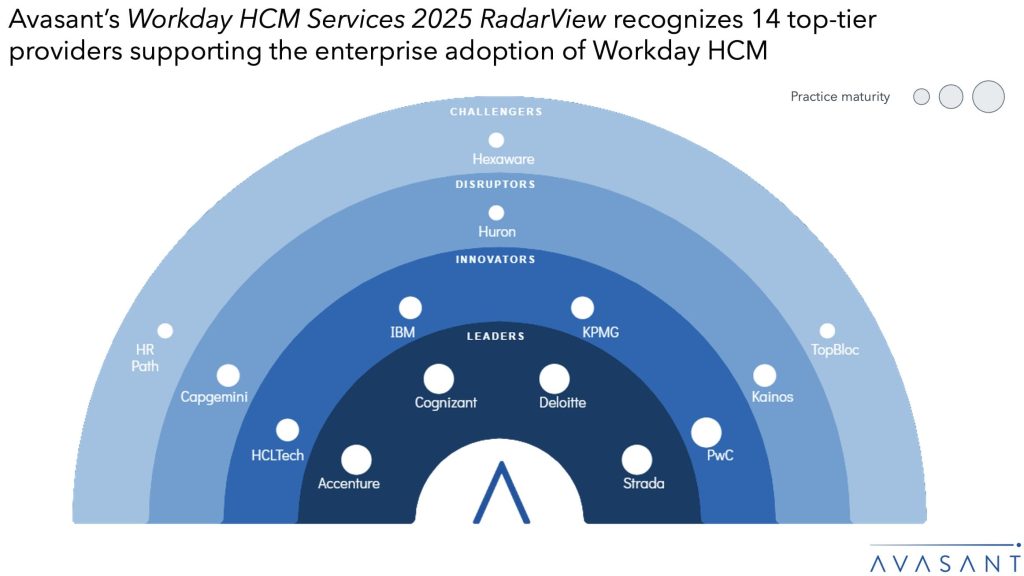 The Workday HCM Services 2025 RadarView™ assists organizations in identifying strategic partners for Workday HCM adoption by offering detailed capability and experience analyses for service providers. It provides a 360-degree view of key Workday HCM service providers across practice maturity, partner ecosystem, and investments and innovation, thereby supporting enterprises in identifying the right Workday HCM services partner. The 49-page report highlights top supply-side trends in the Workday HCM space and Avasant’s viewpoint.