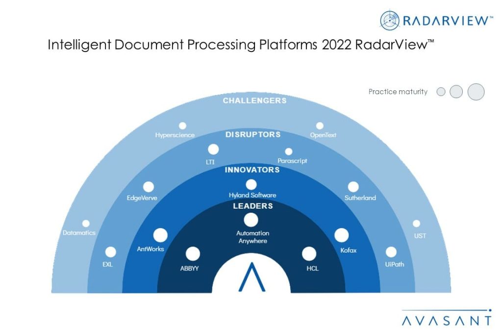The Intelligent Document Processing Platforms 2022 RadarView™ assists organizations in identifying strategic partners for IDP by featuring detailed capability and experience analyses of leading platform providers. It provides a 360-degree view of key IDP platform providers across product maturity, enterprise adaptability, and future readiness, thus supporting enterprises in identifying the right IDP platform partner. The 58-page report also highlights top market trends in the IDP space and Avasant’s viewpoint.