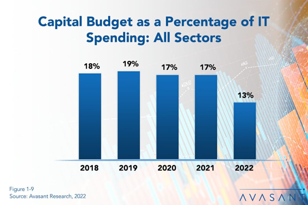 In contrast to the strong growth in nearly all IT spending metrics this year, IT capital budgets continue to fall as a percentage of total IT spending. Once a major indicator of the health of IT spending, capital spending has declined consistently as a percentage of total IT spending in the last 10 years as software as a service and the cloud have changed the way IT organizations do business. Across nearly all sectors, capital budgets are becoming less relevant. This research byte is a brief description of some of the findings in our IT Spending and Staffing Benchmarks 2022/2023 study.