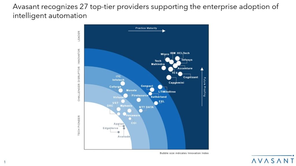 Advancements in agentic AI are redefining the intelligent automation landscape, enabling autonomous processes with minimal human touchpoints. Enterprises are increasingly demanding outcome-driven intelligent automation initiatives that go beyond task-level efficiency to deliver measurable business impact. In response, service providers are developing frameworks and platforms that support the seamless orchestration of RPA bots, AI agents, and humans across end-to-end workflows. This shift is accelerating the adoption of intelligent automation programs across enterprises. Both demand- and supply-side trends are covered in Avasant’s Intelligent Automation Services 2025–2026 Market Insights™ and Intelligent Automation Services 2025–2026 RadarView™, respectively.
