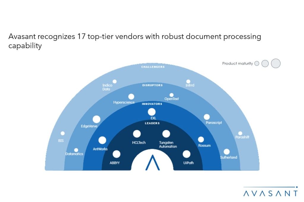 Government e-invoicing mandates, greater integration with enterprise systems, and the rise of Gen AI use cases have driven a surge in intelligent document processing (IDP) adoption. In response, vendors are enhancing their platforms with patented technologies and developing industry-specific IDP solutions to accelerate time to market. Larger enterprise application providers are acquiring IDP vendors to expand their portfolios, fueling industry consolidation and workflow optimization. These advancements have elevated IDP to an essential operational tool within traditional enterprise systems, enabling faster deployments and improved efficiency across business functions. Both demand- and supply-side trends are covered in Avasant’s Intelligent Document Processing Platforms 2024–2025 Market Insights ™ and Intelligent Document Processing Platforms 2024–2025 RadarView ™, respectively.