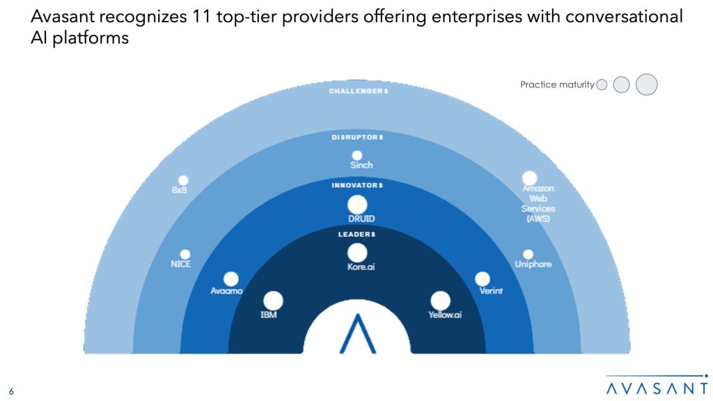 The Conversational AI Platforms 2024 RadarView™ assists enterprises in evaluating key vendors providing conversational AI platforms. It provides a 360-degree view of key conversational AI platform providers across the dimensions of product maturity, enterprise adaptability, and future readiness, thereby supporting enterprises in identifying the right platform partners. The 31-page report highlights top supply-side trends in the conversational AI space and Avasant’s viewpoint on them.