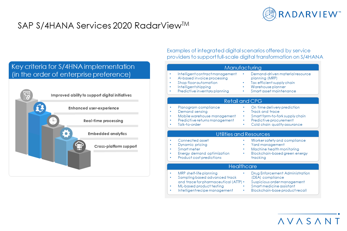 The report features highly detailed, comprehensive RadarView Profiles of the top 18 service providers and their solution offerings for S/4HANA. This is also a good reflection of how the service provider landscape has evolved in the way they are investing in cognitive technologies and S/4HANA certifications, developing reusable and off-the-shelf assets, and strengthening their partner network.