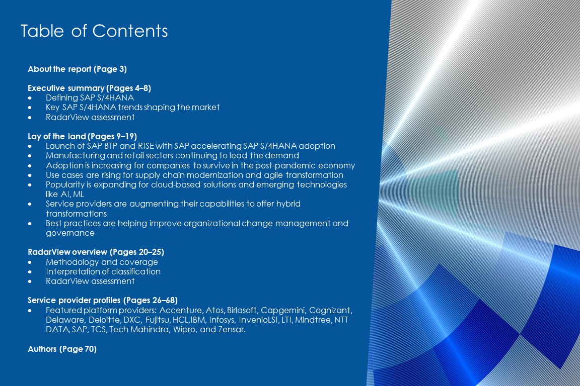 This RadarView includes a detailed analysis of the following SAP S/4HANA service providers: Accenture, Atos, Birlasoft, Capgemini, Cognizant, Delaware, Deloitte, DXC, Fujitsu, HCL, IBM, Infosys, InvenioLSI, LTI, Mindtree, NTT DATA, SAP, TCS, Tech Mahindra, Wipro, and Zensar.