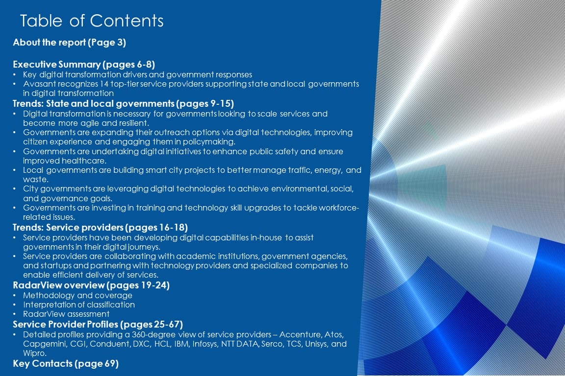 The report provides information to help government agencies plan their strategy and identifies key global service providers and system integrators that can help government agencies expedite their digital transformation. It begins with a summary of top trends shaping the state and local government space and Avasant’s viewpoint on the direction of the industry over the next 18–24 months.