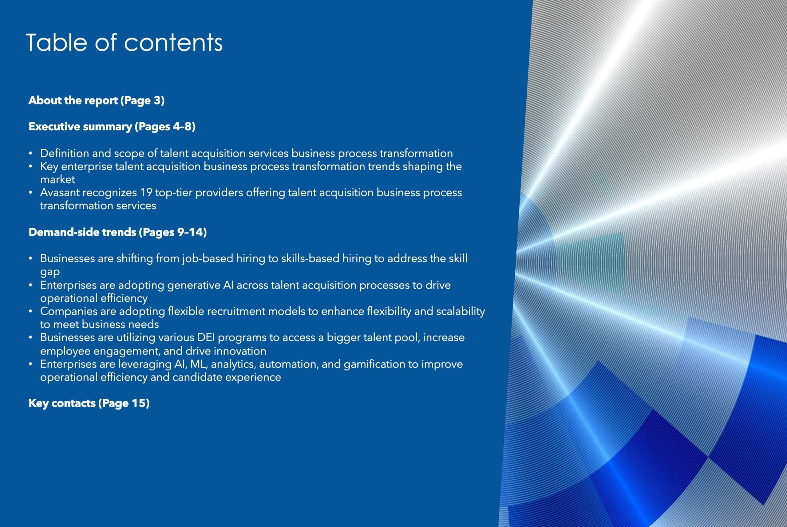 This report identifies key demand-side trends in the talent acquisition business process transformation services space, helping enterprises fine-tune their talent acquisition operations. It provides an overview of key observations and business challenges that Avasant considers important to highlight in the talent acquisition outsourcing space.