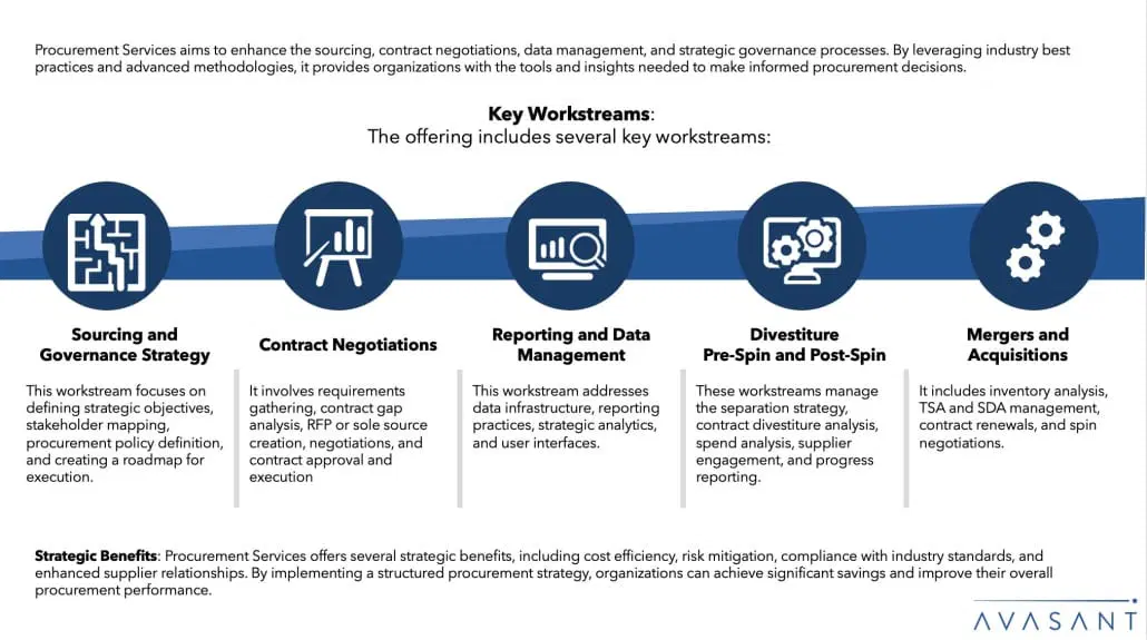 Procurement Services encompasses several key workstreams, including sourcing and governance strategy, contract negotiations, reporting and data management, divestiture pre-spin and post-spin, and mergers and acquisitions.How does Procurement Services ensure compliance with industry best practices?