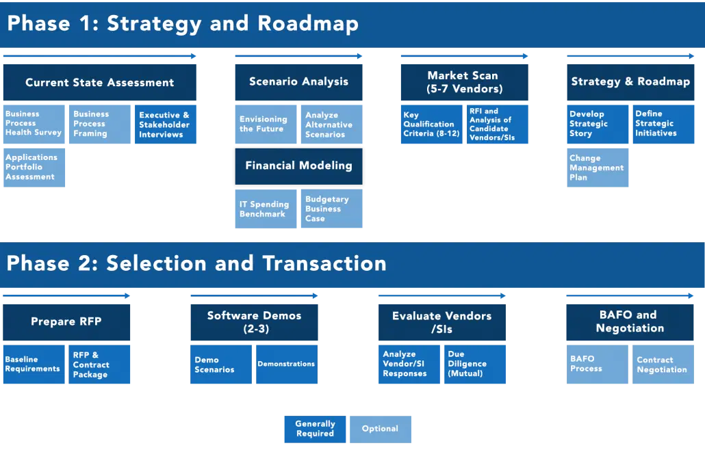 Phase 2: The vendor selection and procurement transaction. This will be based on the strategy and roadmap defined in Phase 1. Here we prepare a formal request for proposal (RFP) and facilitate vendor demonstrations. We typically include systems integrators in this process so that we are evaluating implementation partners and software vendors as a team.